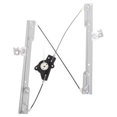 Then with your small screwdriver, and there's little tabs that you just kind of push on each side that allow you to pull these clips out. Fast forward here as I just remove all the wire clips so the wire harness comes away from that inner panel. Then disconnect, this is your window harness. Press this button to disconnect that, and now we're going to remove these 10-mm bolts around the perimeter. And crank up the speed again as we just remove those 10-mm bolts that hold the panel to the door. Now we're going to remove the four nuts that hold the regulator rails and the three bolts that hold the window motor. OK, you push this plug through and pull this panel off. That reveals our window. There are two bolts right down here. I'm going to remove those. And speed up as I remove those two bolts, and you'll notice I kind of hold the window up just to make sure it doesn't fall down. And after we remove those we'll lift our window right up. So we put some painter's tape on there just to hold the window up. Then pull your non-functioning regulator out. Then now on the bench here, you'd remove your window motor by undoing three 8-mm bolts. Speed up here as I remove those three bolts. OK, now if your regulator is still in good shape and you're changing you power window motor, then you'll want to be very careful when you pull this out to hold the gear in, OK? Then if you're changing your window regulator and your motor's still good, when you get your new regulator it'll have a wire tie on it, you'll want to snip that wire tie to hold that gear in there.