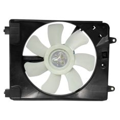 To remove the AC condenser fan, there are two 10 millimeter bolts on top. The fan sits on some pins in the bottom of the radiator. So I'm going to spray some rust penetrant on the bolts, on the backside of them. Take a 10 millimeter socket ratchet. Remove these. Get them both loosened up. Bolts removed. And lift it up and off of the pins. Bolts got kind of rusted in there. Lift it straight up and out. See those pins are kind of rusty because I got stuck in there.