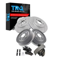 In this video, we're going to show you how to service the front brakes on this 2000 Chevy Cavalier. It's pretty much the same as any Cavalier from this generation. We're going to show you the right hand or passenger side. The left hand, the driver's side's, the same, and we always recommend you service your brakes in pairs. For these front brakes you'll need new pads and rotors from 1AAuto.com, jack and jack stands, 19 millimeter socket with a breaker bar, 3/8 inch Allen wrench with a pipe for some leverage, a large screwdriver or a small pry bar, a large C-clamp, brake or white grease, and a torque wrench.