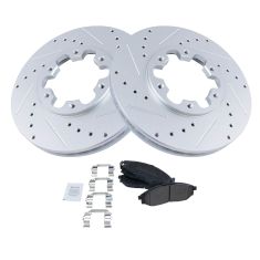 In this video, we're going to show you how to service the front brakes on this 2003 Nissan Frontier. It's the same procedure right to left as well as 2001 to 2004 for the Frontiers. You'll need new brakes from 1A Auto, 22mm, 21mm, and 14mm sockets, ratchet, jack and jack stands, 6mm Allen socket or key, large and small flat blade screwdriver, circlip pliers, hammer and chisel, and a pipe for extra leverage. You'll also need some bearing grease and rags.